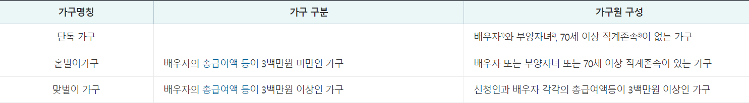 ㆍ 홑벌이가구 : 배우자 또는 부양자녀 또는 70세 이상 직계존속이 있는 가구(배우자가 있는 경우에는 신청인 또는 배우자의 총 급여액 등이 3백만 원 미만이어야 함)