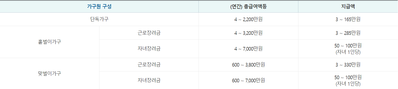 ㆍ 맞벌이 가구 : 3,800만 원 미만 (자녀장려금)
