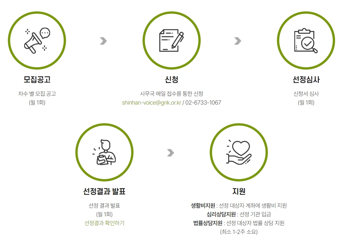 - 소송 : 기본 상담 진행자 중 소송 지원 가능 대상 민사 소송 지원. (변호사 비용과 소송 실비 등)