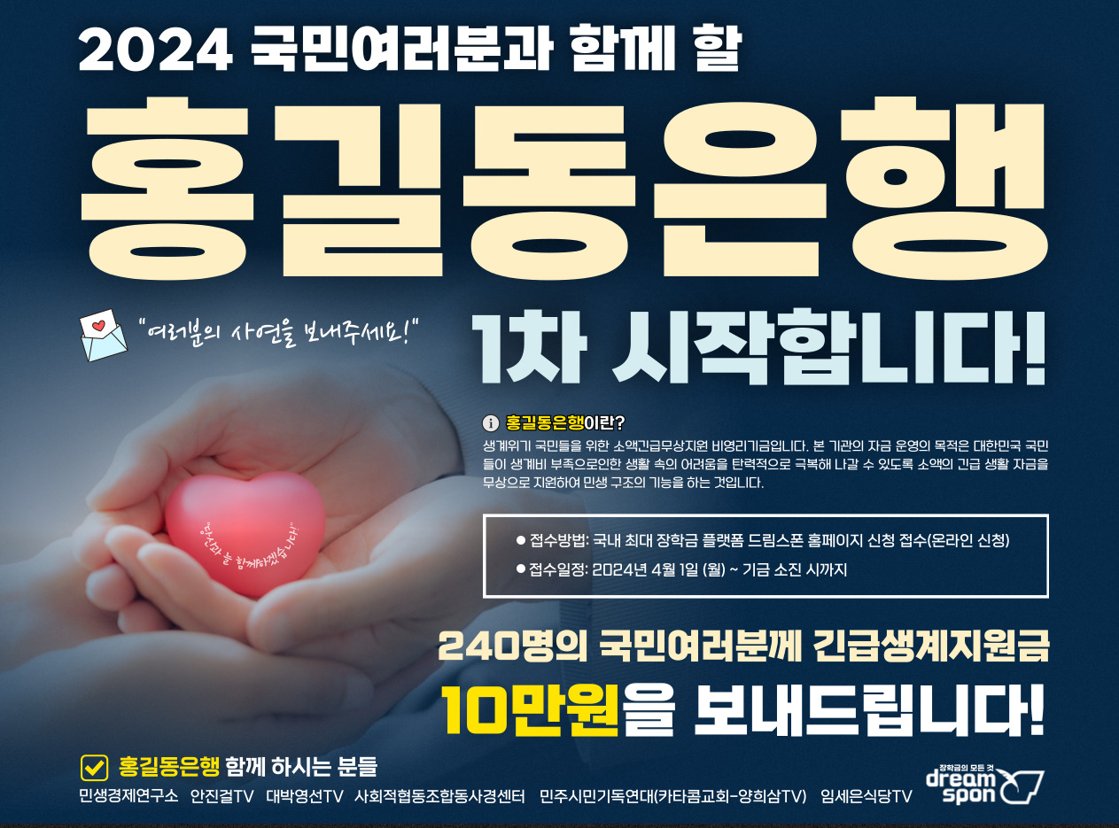 많은 사람들이 생활의 어려움에 직면하고 있지만, 그 속에서도 많은 이들이 지원의 손길을 미처 받지 못하고 있는 현실이 있습니다. 이에 따라 홍길동은행은 생계위기에 처한 국민들을 위한 긴급무상지원 비영리기금을 설립했습니다.